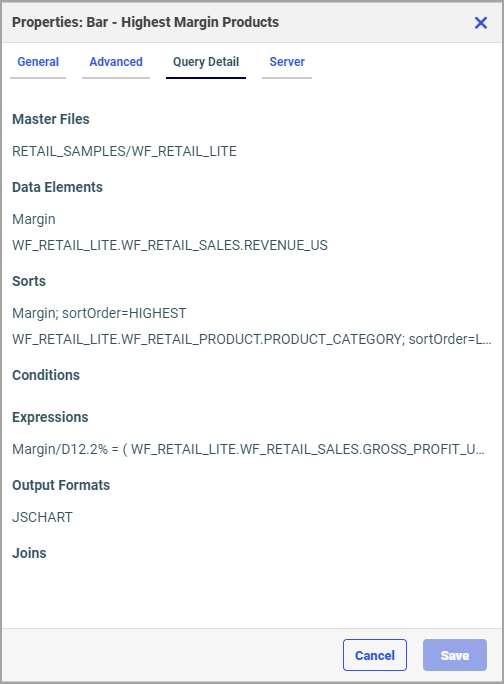 The Query Detail Properties tab, which is shown in the following image, is only available for reports, charts, and visualizations. It shows which data elements, parameters, and conditions were used in an item.