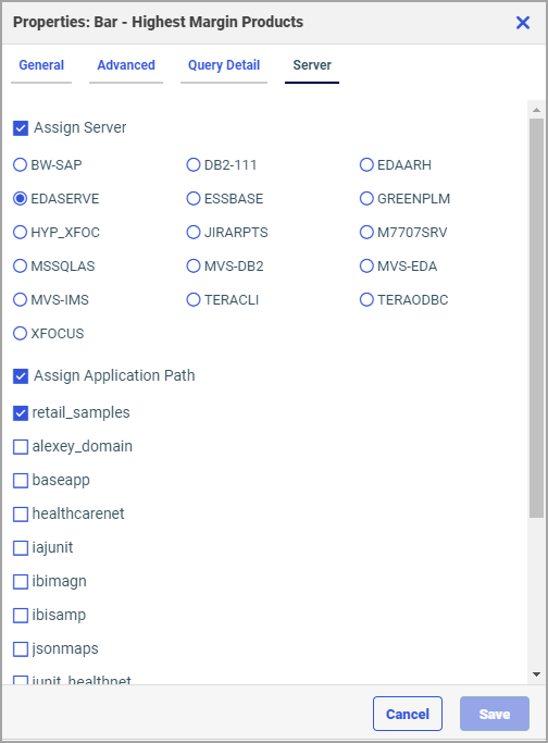 To change the server, select the Assign Server check box, and then select a server from the list. You can also change the application path in the same way.
