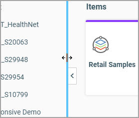 You can also customize the width of the Resources tree. To do so, place your cursor on top of the right edge of the Resources tree area, as shown in the following image, and drag the edge to achieve the desired width. Your new width is remembered, and displays the next time you sign in to WebFOCUS.