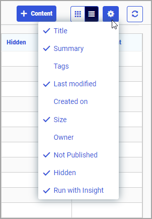 In this view, you can sort your items by clicking any column title. Each column features a three-step toggle sorting: ascending, descending, and return to the default. You can also specify which columns display in the content section by clicking the Select Display Columns button, and selecting the columns you want to view from the list. An example of an expanded columns menu is shown in the following image.