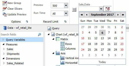 If you are creating a slicer on a full date field, a calendar icon displays adjacent to the field. You can use this icon to select a date using a calendar control, as shown in the following image.