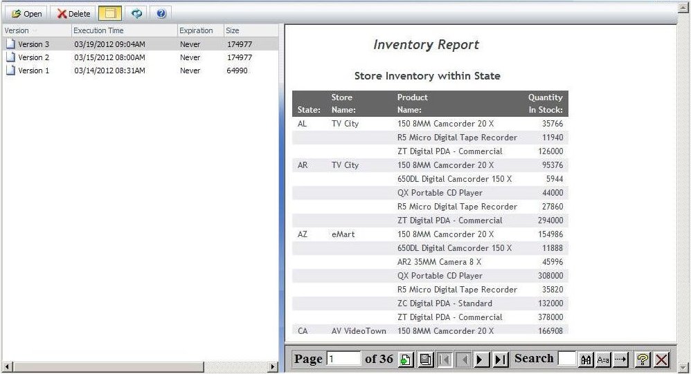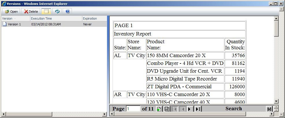 From the Library Versions listing, you can view a Library report in a new window by selecting the version of the report and then selecting the Open option from the toolbar or the context menu. You can also view the report in the view pane, displayed to the right of the version listing, by selecting the Show View Pane toolbar option. The following image shows the Product Packaging and Price report displayed in the View pane.