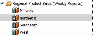 The following image shows the Resources tree with a Regional Product Sales (Weekly Reports) folder expanded to list the burst report sections. The Northeast report section is a Watch List report.