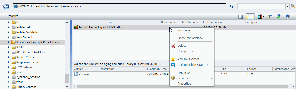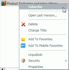 Right-click the Library report you want to add to your Watch List and select Subscribe from the drop-down list. If the report is burst, subscribe to each report section you want to add to your Watch List. The following image shows the Subscribe option from the ReportCaster Explorer Library report list for the Product Packaging and Price Library report.