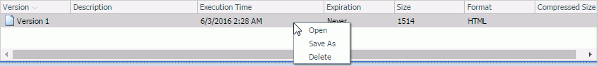 To view a Library report version in a new window, double-click the report version or right-click the report version and select the Open option, as shown in the following image.