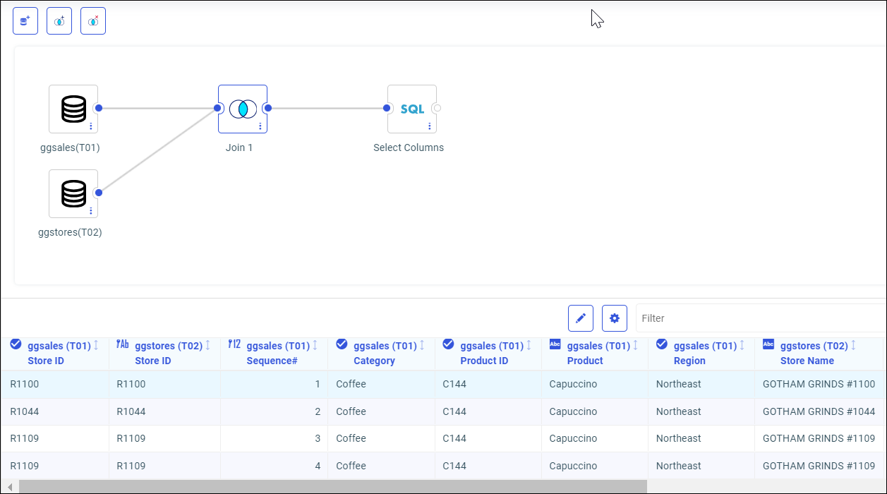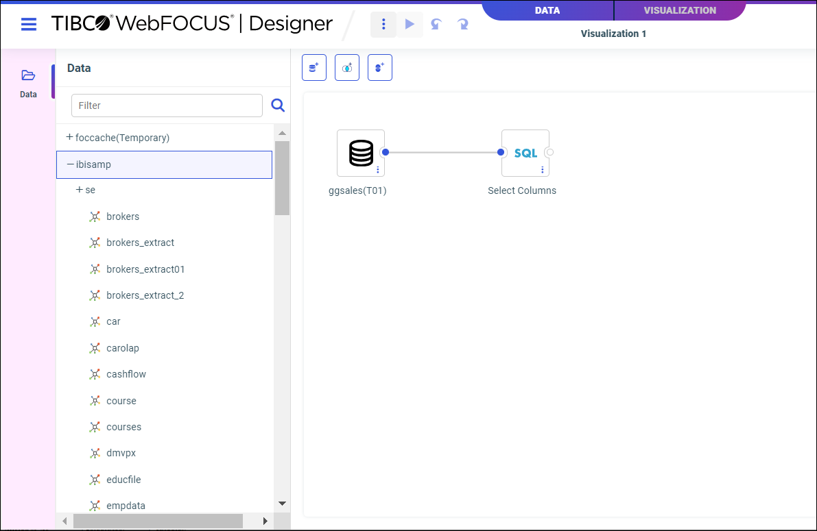 Note: You can switch back and forth between the Data and Visualization tabs. Modifying your data flow may change or delete any associated visualizations. For more info on creating visualizations, see Creating Content in TIBCO WebFOCUS Designer.