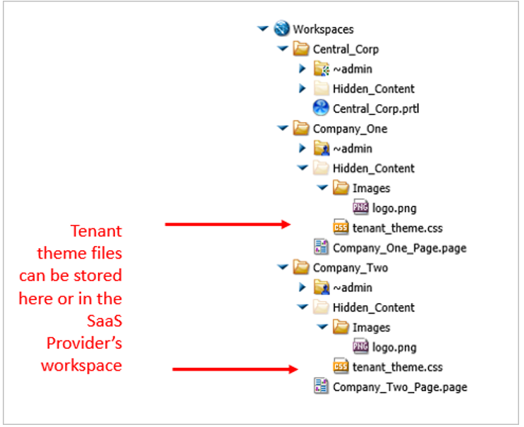 In this specialized portal configuration, each tenant workspace contains the users assigned to a specific entity. As shown in the following image, they also contain files for the logo and theme that customize the portal interface to a look and feel that is familiar and appropriate for the members of the selected group.