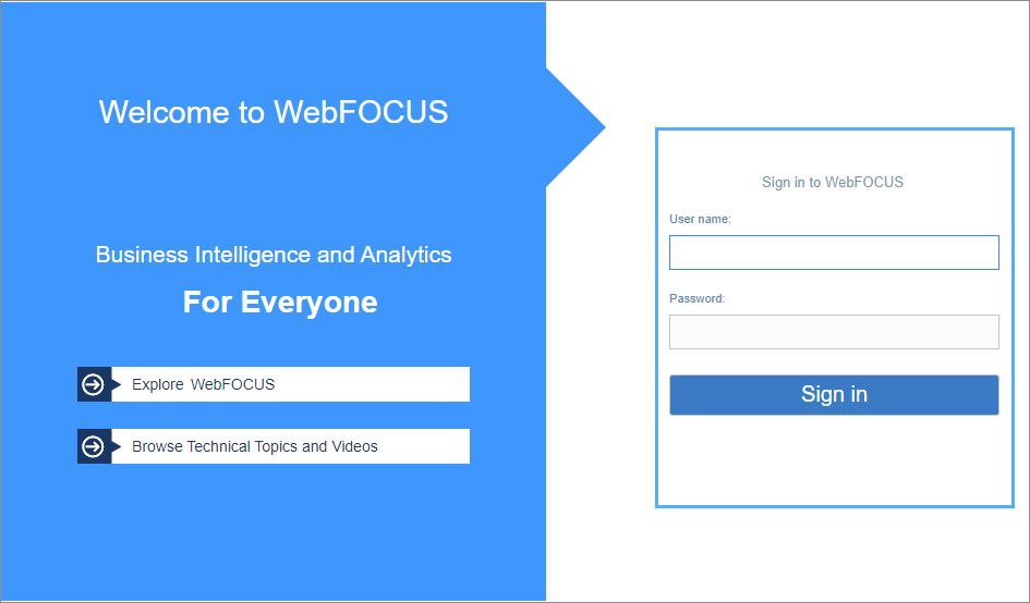 You can launch WebFOCUS from any web browser, using the address created during the installation. The sign-in page and default home page may be different depending on the configuration requirements of your organization.