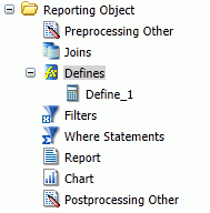 Users using the Reporting Object to create a report do not see the DEFINE statements, WHERE statements, or JOIN commands defined in the Reporting Object, which are issued automatically every time a user accesses the Reporting Object. However, the report or chart components, including headers, footers, and styling features, are visible to authorized users who can use them to create their own customized report.