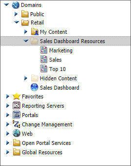 When you create a collaborative portal, a Resources folder with the same name is automatically generated. The Resources folder is used to store pages for each portal under the workspace. The following image shows the Sales Dashboard Resources folder, which contains the pages for the Sales Dashboard portal, in the Resources tree of the Legacy Home Page. If you are working from the new WebFOCUS Home Page, this folder is visible when you click the workspace in the Workspaces view.