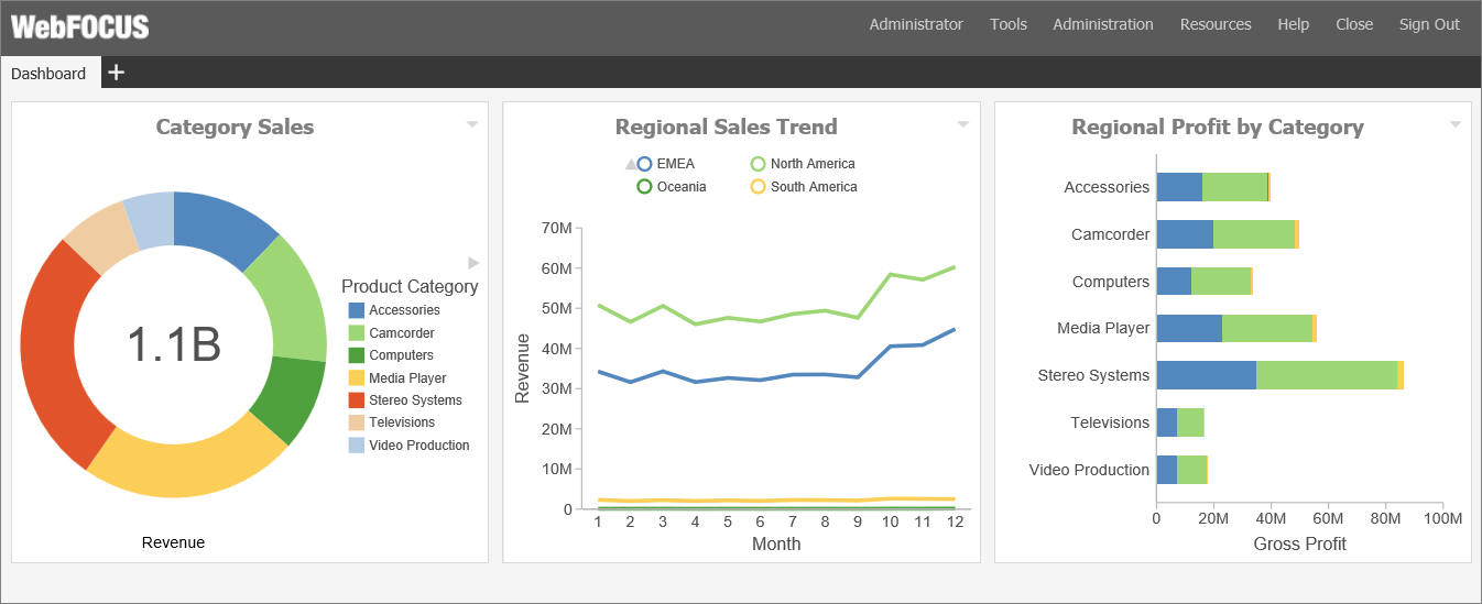 The Workbench page can be used to work with workspace content. It displays the Resources tree and report output area. When you run a content item, it appears in the report output area. Multiple content items appear as tabs.