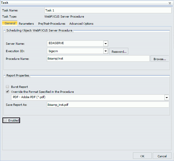 To create a task, if applicable, verify the Path, Procedure, Server Name, Execution ID, and Password. For Report Properties, indicate if you want to burst the report (FEX) output. Optionally, select the Override the Format Specified in the Procedure check box to override the format specified in the procedure with a selection from the drop-down list. The following image shows the Task dialog box for a WebFOCUS Report task.