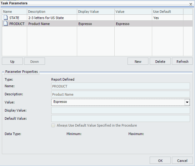 The following image shows the Task Parameters dialog box displaying the PRODUCT parameter. In the value column, the PRODUCT parameter has a value of Espresso. Since the PRODUCT parameter has a list of possible parameter values, there is no default value specified. Therefore, the Use Default column is blank.
