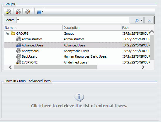 The Groups field in the Users & Groups tab of the Security Center lists all of the groups in the repository in hierarchical order. In the Groups field, subgroups are indented below their parent groups. The Users in Group field lists the members of a selected group. If no group is selected, the field is blank. The Search field in this tab allows you to search the name and description fields for groups. Simple wildcard searches are supported. A toolbar allows you to perform the following actions: