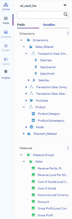 The fields in your data source are available from the Fields tab. By default, if the data source uses folders to organize the fields that it contains, these folders are reflected in the Fields tab. This folder organization is called a business view. For dimension fields, these folders could be field hierarchies defined in the data source or segments in the data based on different tables that have been joined together. Measures can also be grouped based on segments.