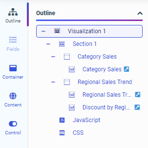 When the visualization has been transformed into a page, the outline also includes the JavaScript and CSS options, which allow you to add custom code to style and add run-time behavior to your visualization. This code can reference classes that you specify for visualization components using the Classes property.