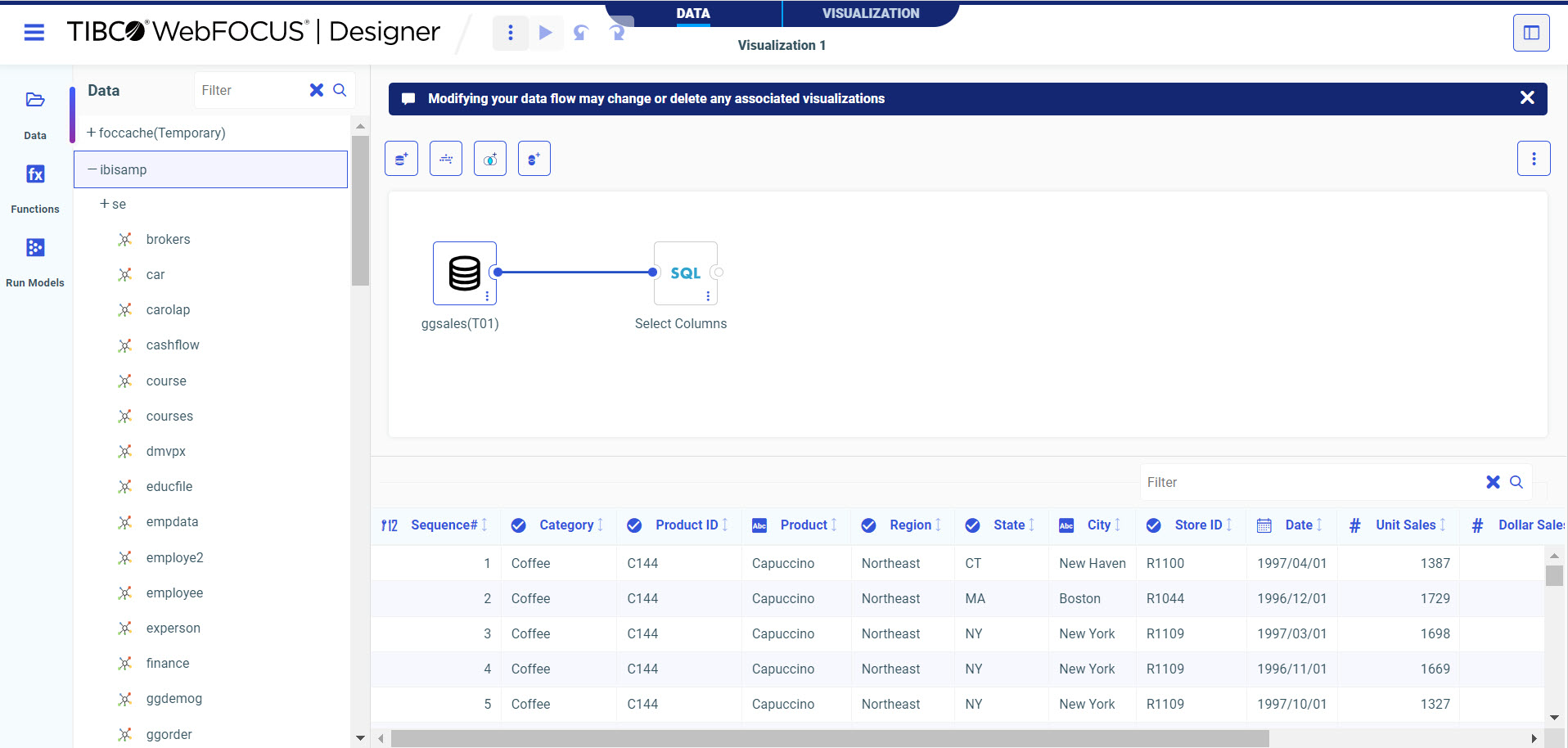 WebFOCUS Designer is divided into a Data tab, which provides options to prepare, profile, and join your data sources, and a Visualization tab, where you can create charts and reports using that data and arrange your content on a page. When creating a visualization with existing content, only the Visualization tab is available, since you do not specify a data source.