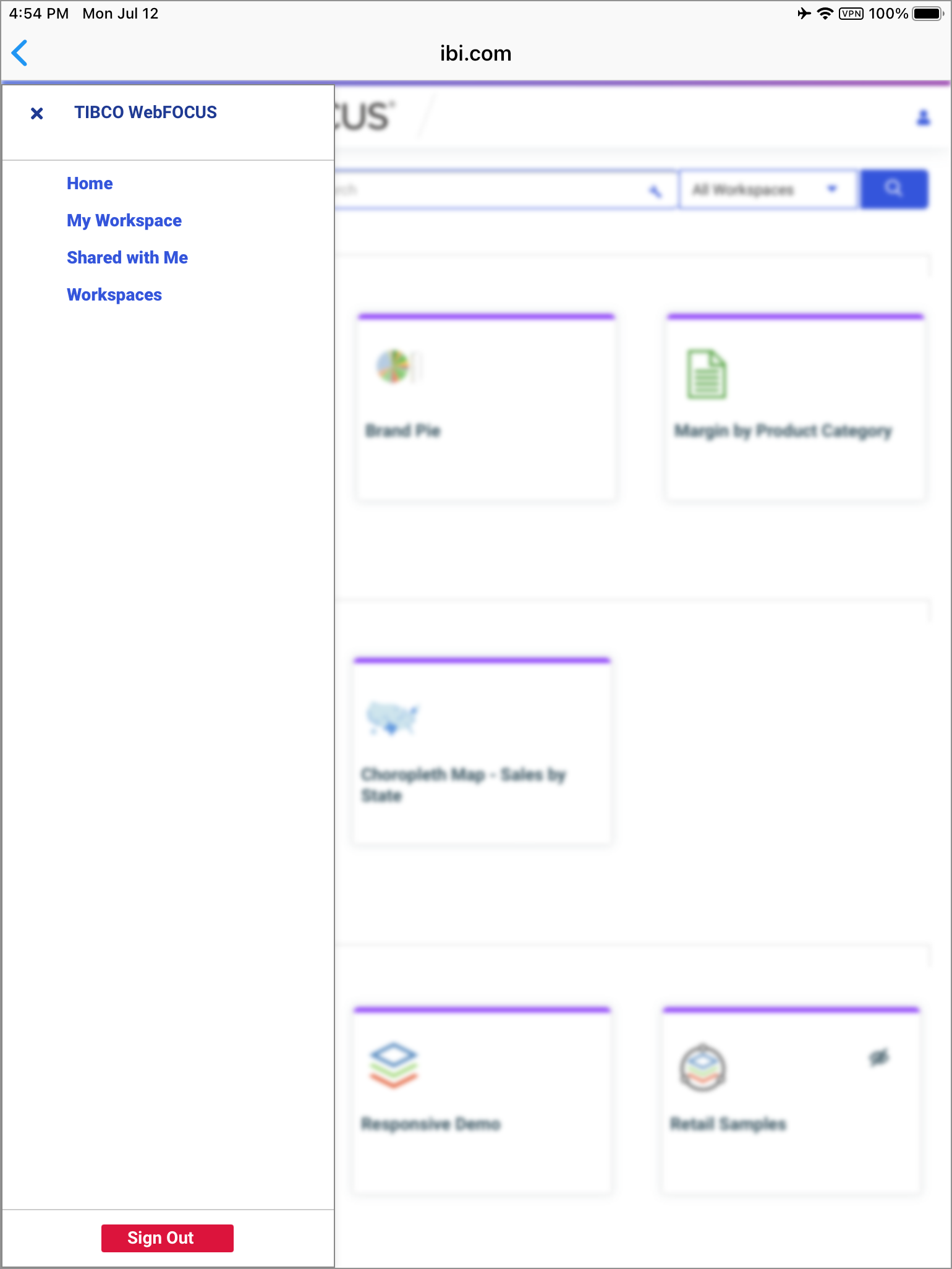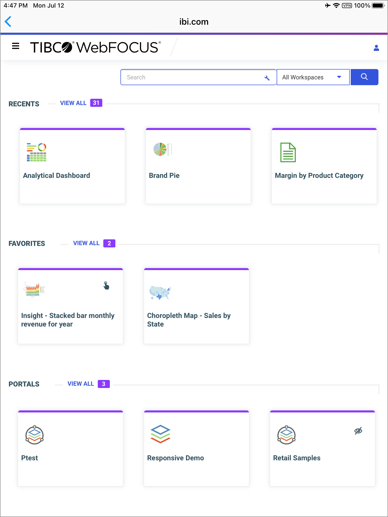 Note: Depending on the type and size of your device, your display might switch to the full version of WebFOCUS in the landscape view.
