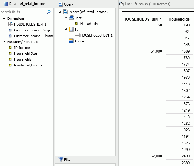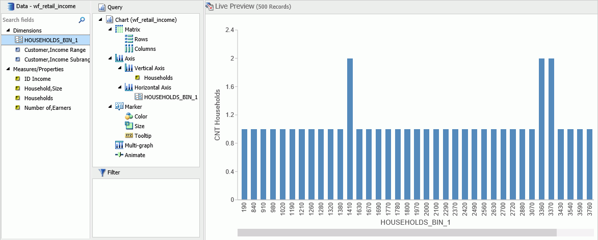 The bin value is designated as a dimension field, since it is a limited field with a discrete set of possible values that was created from a field with an unlimited, continuous range of values. The measure displays as a count (.CNT) field and the related bin is created in the Query pane. It is also placed in the Data Pane for future use.