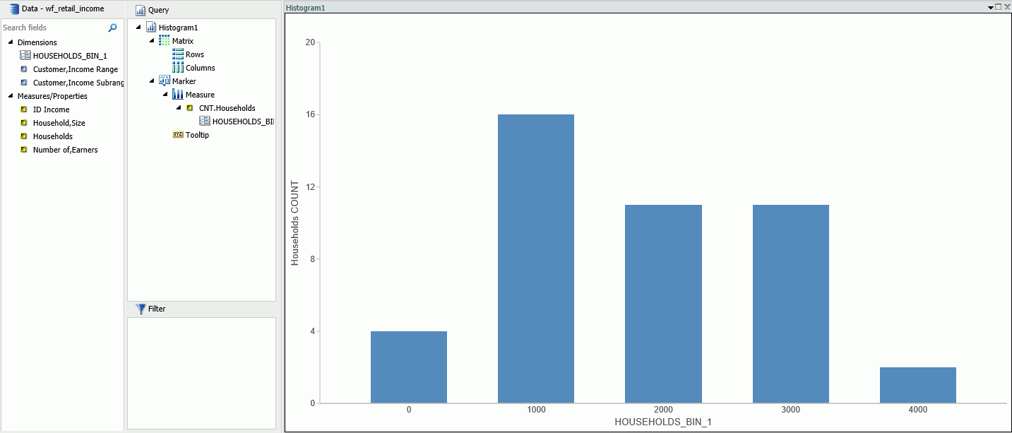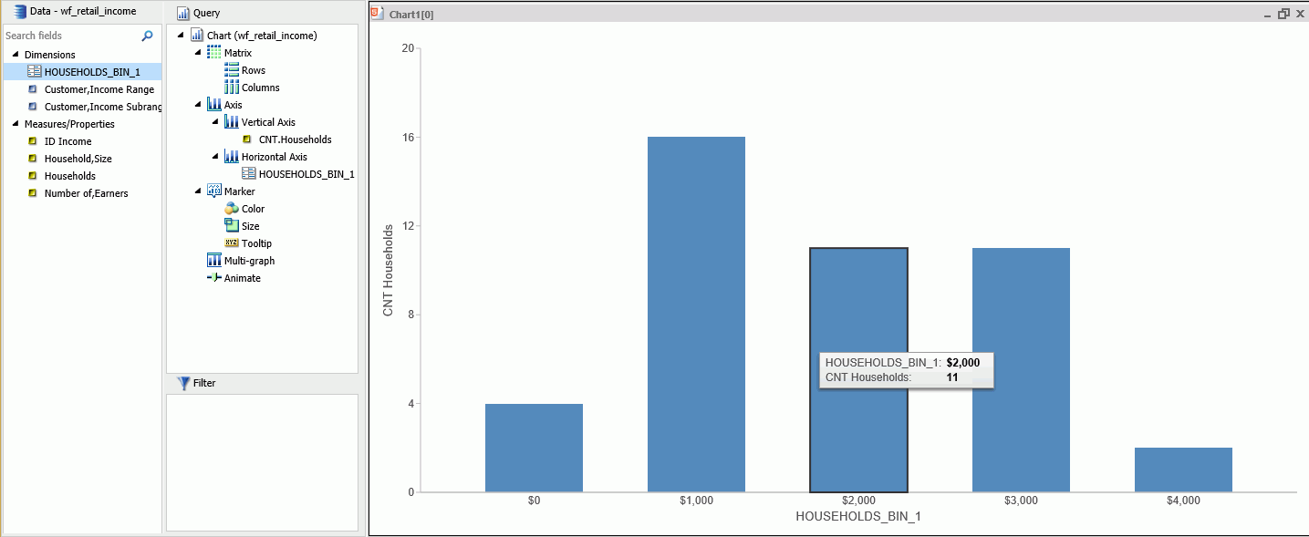 For example, you can review the range of expenses incurred by households. In the following example, these ranges are represented by bins that are grouped by $1000. In this case, you can see that the largest number of households had the smallest expense (16) while the trend declines as the bin size gets larger. With binning, you can see the frequency of how often values in a range appear across the different groupings, as shown in the following image.