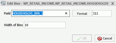 Note: When creating a bin, the format of the bin and the value set for the Width of Bins must be compatible. If the Width of Bins is a large decimal value, define the field format to match the format of the field being converted so that the bins can be successfully generated with the appropriate numeric precision.