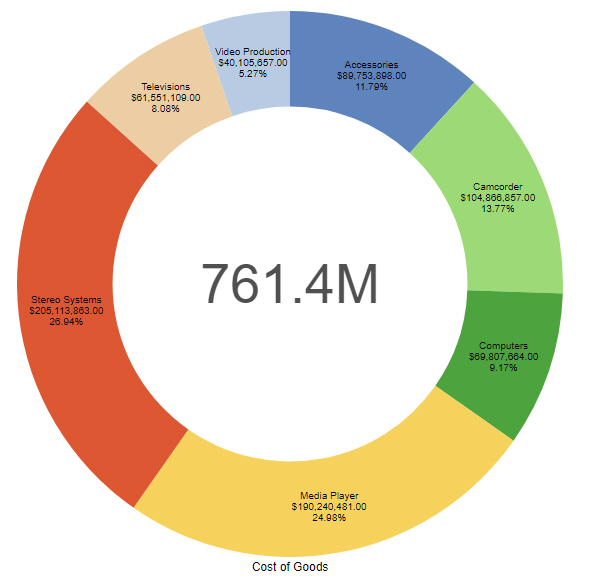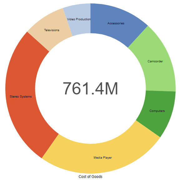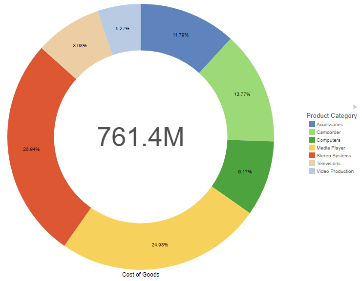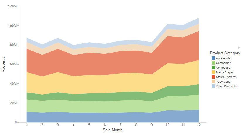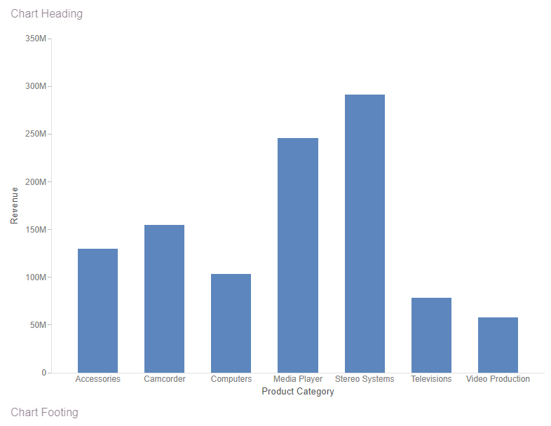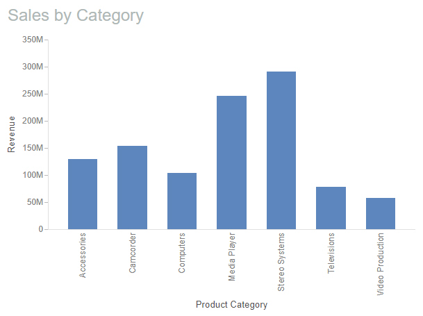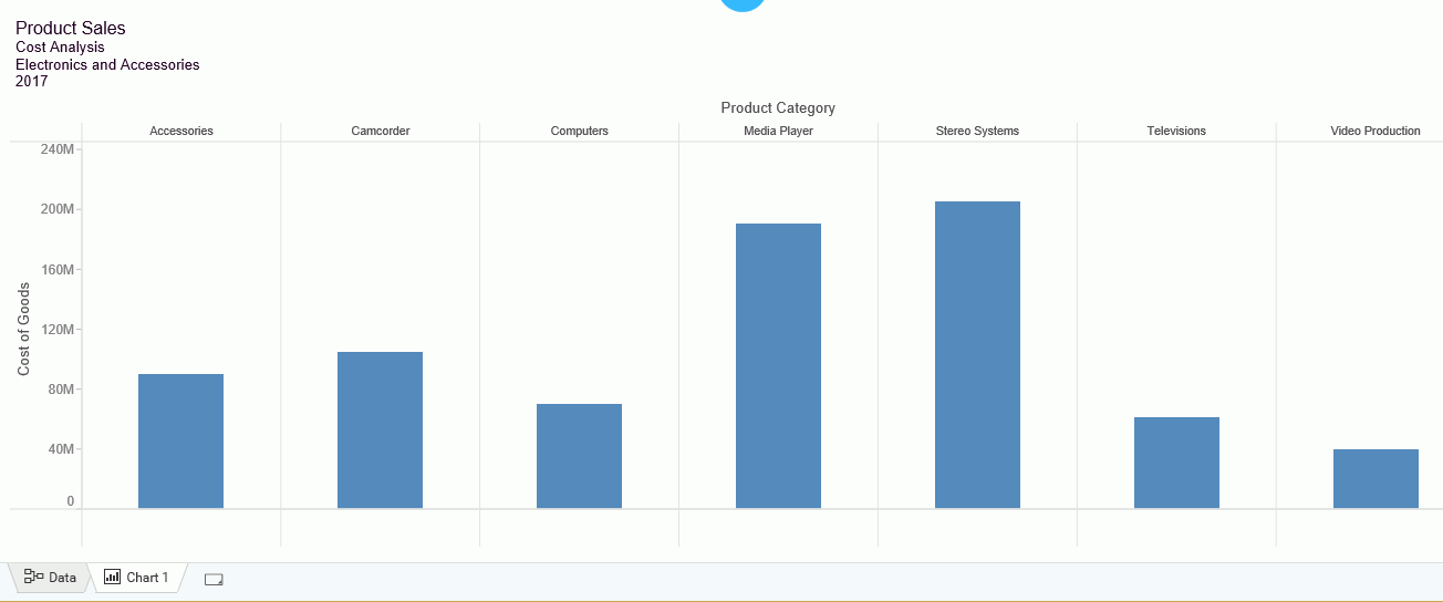 Charts allow you to present information graphically, using such visual cues as color, size, and position to convey relationships between measures (numeric fields to be aggregated) and dimensions (categories) and to identify trends and outliers. You can create a wide variety of charts. For example, you can review your data (Gross Profit and Product Category) using different chart types (for example, bar chart, area chart, or line chart). The chart options give you an edge in deciding which chart to use to highlight certain information or trends.
