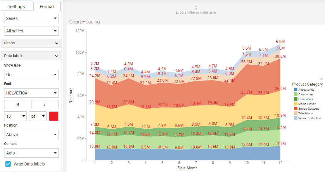 Having the ability to format by series gives you control over your content and allows you to customize display options at the series level. For example, you might want to color code a chart based on a range of values. You can also specify options for the data labels of the series. By default, these are enabled or hidden automatically depending on the chart type, but can be turned on or off. You also have the standard suite of font options, as shown in the following image.
