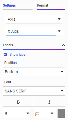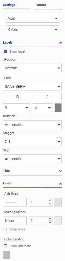 Depending on the chart type (for example, bar chart), you can format the axes to customize the display of the information. This includes items such as labels, titles, and font formatting. For example, you can choose to hide the labels in your chart or format the font to add clarity to your chart. You can easily customize the X and Y axis with options that suit your needs. To access these options, select Axis from the quick access menu on the Format tab. Other options, such as dual-axis, bi-polar axis, and split axis behavior, and a continuous time axis, are available by right-clicking a field once it has been added to your chart or using the menu next to the Vertical bucket.