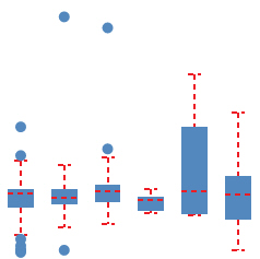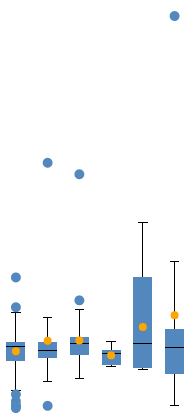 A box plot is a common chart type used to show key distribution information for a set of data points. A box plot displays outliers, the median, the upper and lower quartile, and the maximum and minimum with outliers excluded, by default. However, you can use the Box Plot options on the Format tab to show the mean, or average, as well. Additionally, you can change the display of the whiskers from lines to boxes, and change the style of the median and whisker lines.