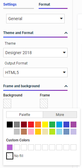 You can access the color picker from any of the sections on the Format tab. You can also access the color picker when working with headers and footers. When you access the color picker, the color picker displays the Palette tab, by default. From this tab, you can select from up to 20 pre-defined color options. You can also select the No Fill option, which displays the selected content as transparent. This is particularly useful in cases where you might want to prevent (or hide) the display of information.