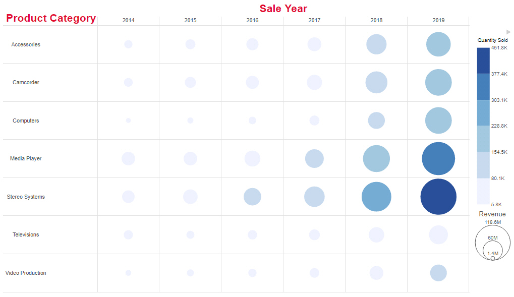 Depending on the type of chart you use, adding data to a specific field automatically generates a title for the chart legend. For example, the following image displays a matrix marker chart that allows you to compare the differences between values by circle size. Since the measure Gross Profit has been added to the Size bucket, the legend title for this chart shows as Gross Profit, which is highlighted in the following image.