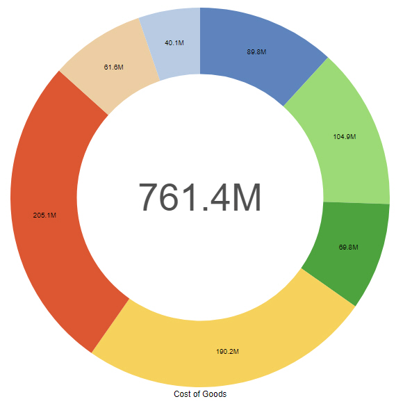 When creating a bi-polar axis chart, it may be useful to change the chart type of the risers for one of the measures on an axis to differentiate it. Right-click the measure field in the Vertical bucket (or the Horizontal bucket if the axes have been swapped), point to Shape, and choose whether the chart type for that measure should be bar, line, or area. The following image shows a bi-polar axis chart in which the Cost of Goods field is represented by a line chart.