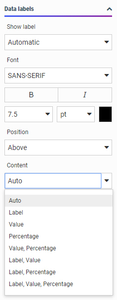 When working with series in a chart, you can also set an option to control the display of data labels in your chart. The default is Auto. This gives you the ability to specify how your data will be presented (for example, by Value or Percentage), which is particularly useful in cases where you want to save real estate when using data labels in your chart, or show additional information. You can click the drop down to access a full list of content options, as shown in the following image.