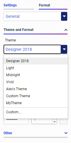 A list of available themes is displayed. As shown in the following image, you can choose from the Designer 2018, Light, Midnight, and Vivid themes that are included with WebFOCUS, a custom theme added to the Global Resources area, such as the themes Alex's Theme, Custom Theme, or MyTheme shown in the image, or click Custom to select a legacy theme or a theme saved to a workspace folder.