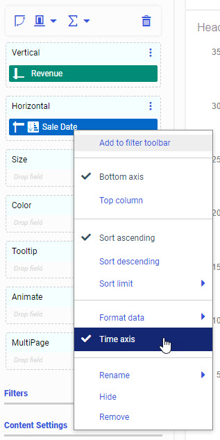 To re-enable the time axis option, right-click the date or date-time field and click Time axis again.