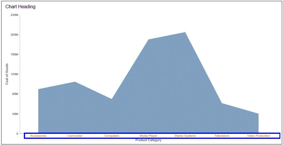 By default, when you create a chart that has a dimension on an axis, missing values are not displayed on that axis. For example, if you create a bar chart showing revenue by product category, but there are no revenue values, including zero, for televisions, then televisions will not appear on the horizontal axis in the bar chart.