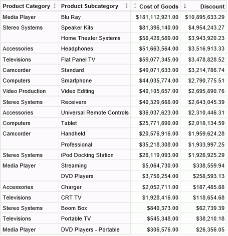 A basic data grid has been created, showing Cost of Goods and Revenue sorted by Product Category across Customer Business Region.