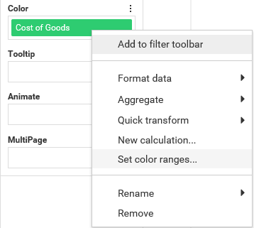 To change the color scale options, right-click a measure in the Color bucket and select Set color ranges, as shown in the following image.