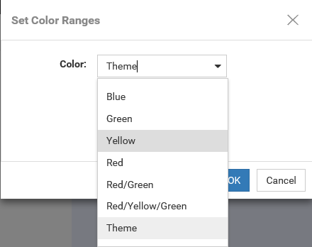 When you make a selection, you can override the color schemes that are available from the theme of your chart. Theme is selected, by default. You can select a different color range, such as Green or Red/Orange, from the list of options, which gives you more control over how color is used in your chart to create contrasts between various aspects. For example, if your chart displays different temperature values using a measure in the Color bucket, you may wish to use the Red/White/Blue option to intuitively show higher temperature values in red and lower ones in blue