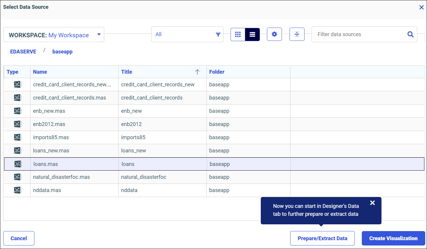 Note: You can click Prepare/Extract Data to further prepare or extract data in WebFOCUS Designer's Data tab.