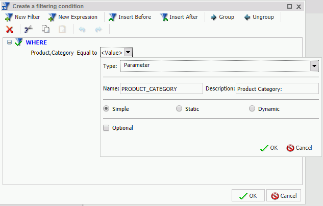 Note: When creating a parameter for a field, the parameter name defaults to the fieldname that you select. In the previous image, the creation of a filter with parameter Product Category is shown. To ensure that the name of the parameter is the same as the sort (BY) field in the Auto Link enabled report or chart, do not change the name of the parameter that is generated by your field selection.