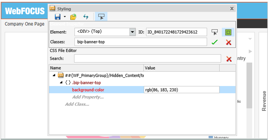 The Classes field is automatically populated with the correct CSS class name for the selected element, in our example bip-banner-top.