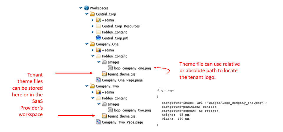 The tenant_theme.css file contains the .bip-logo class that identifies the address of the tenant workspace logo file in the background-image property. It also contains any additional customizations that alter the look and feel of the default portal frame and features.